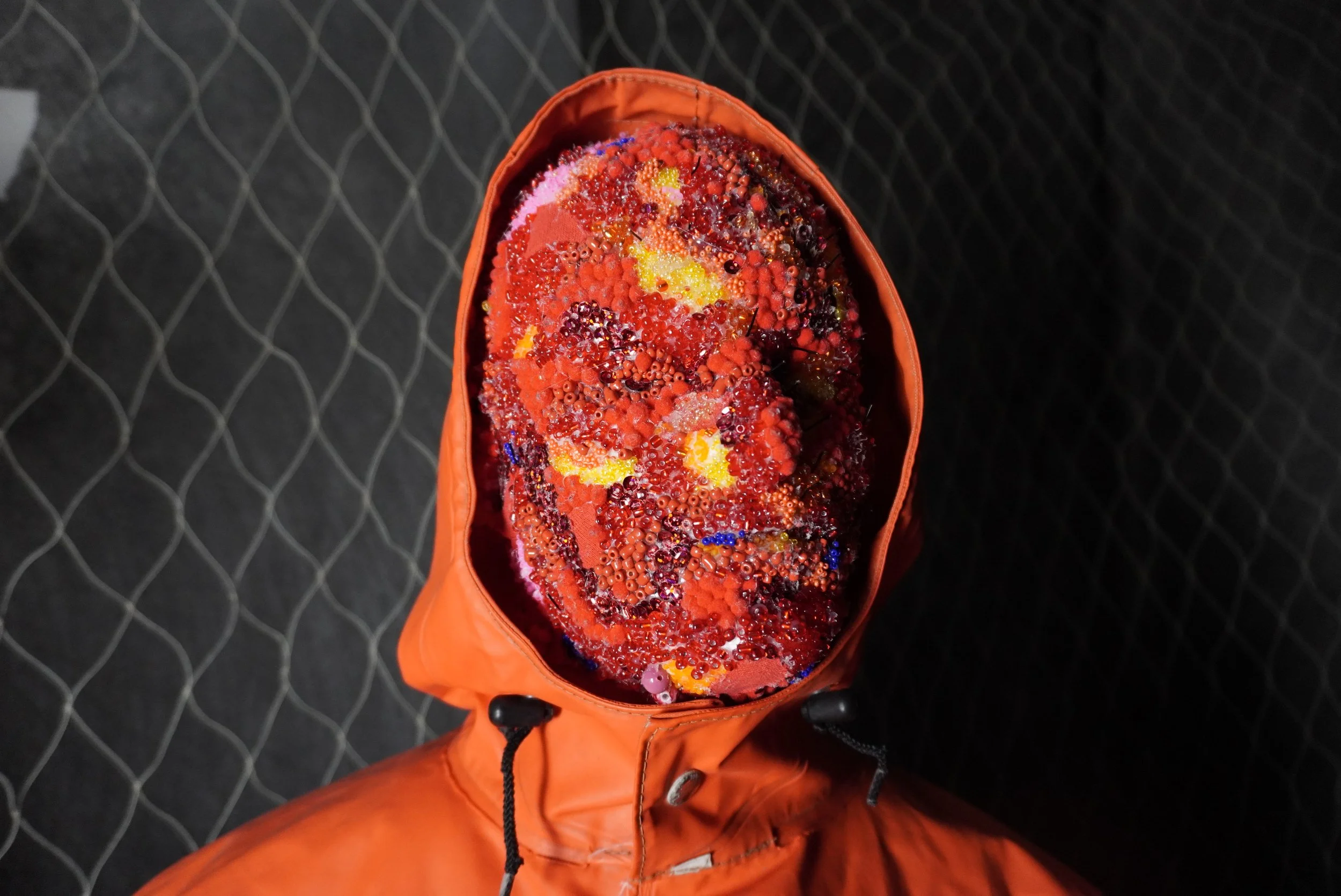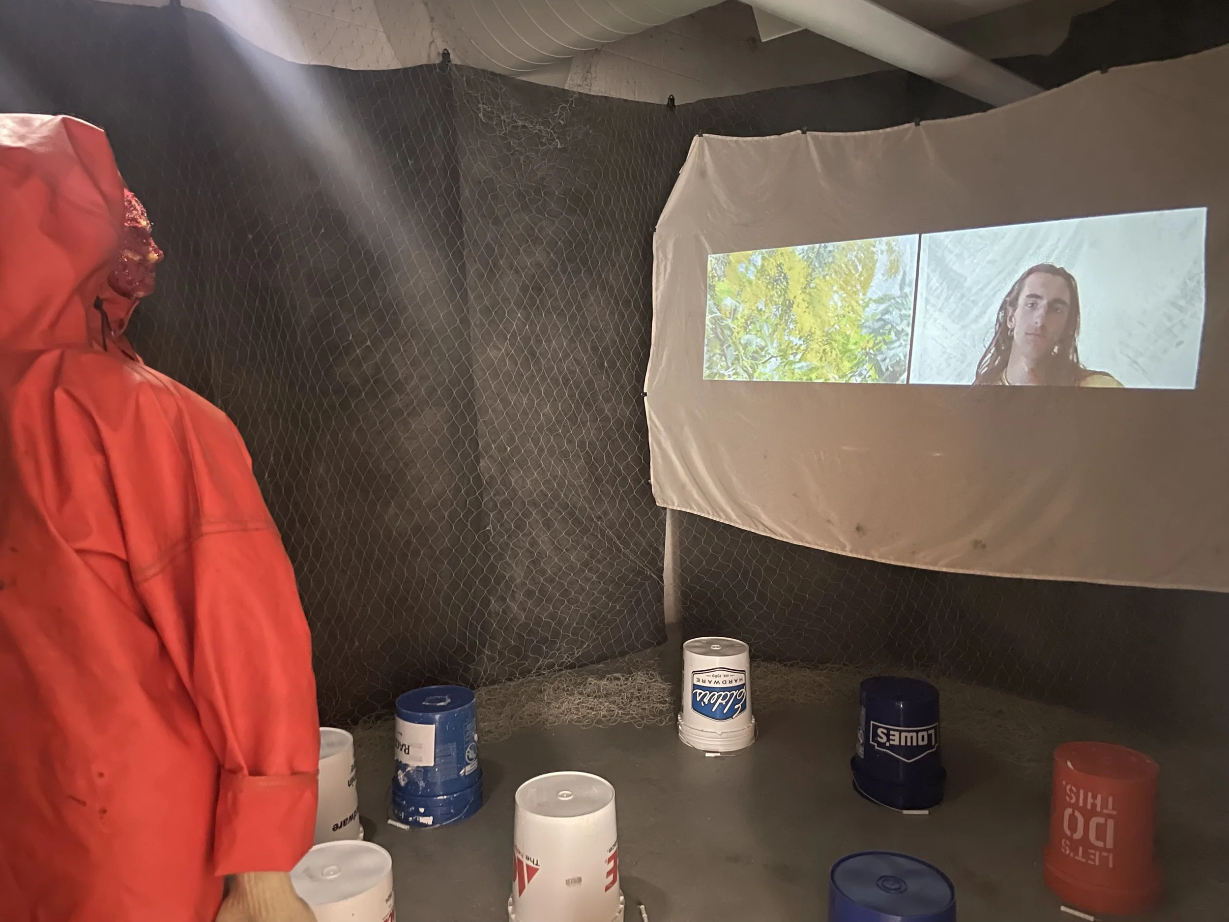 Are you Fishing Again this Summer is a mixed and multimedia art installation comprised of two raingear clad figures, a video projection, a soundscape of piano music and conversations, and a small portion of a gill net spilling out into the gallery. The gill net leads the viewer into the room where they are invited to sit on a bucket, view the projection, and hear the sound collage. Behind them, two figures stand wearing fishing rain gear, their faces beaded and bejeweled to resembles salmonberries. They hold hands and look onward, watching the projection.
