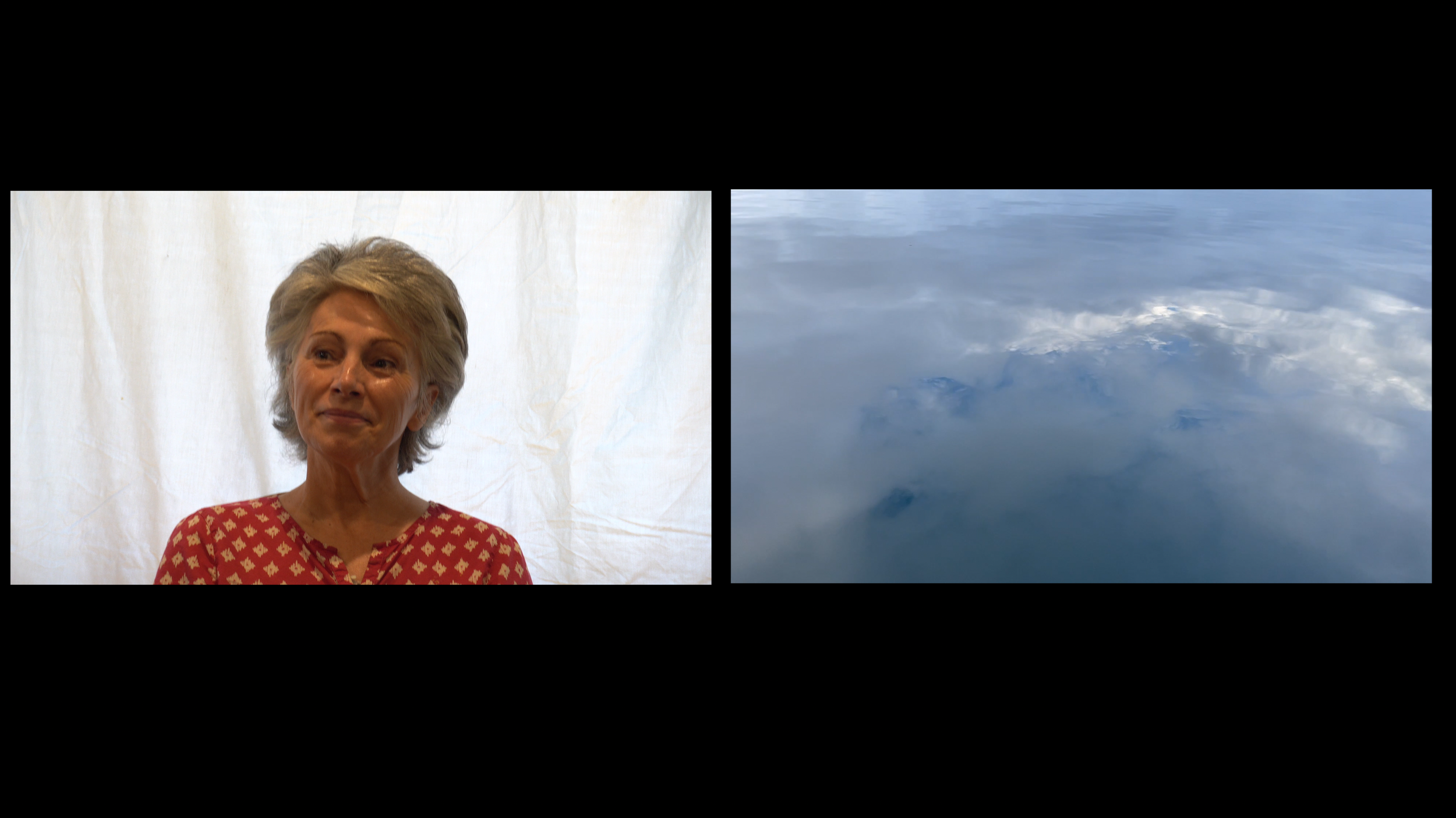 The video footage was captured last summer while I and my family fished, as we always do, for salmon on Harvester Island in Alaska. I carried cameras on land and snuck them into boats, capturing snippets of beauty while working long days. Cut all together now, moving water and landscapes are interspersed with portraits of family members present with me over that summer. Other snippets show figures in raingear on hills and slippery rocks standing as they do now behind the viewer. They represent the family and crew who have worn these clothes and looked upon these views. With my phone I recorded catches of conversations and composed piano music inspired by what I felt.